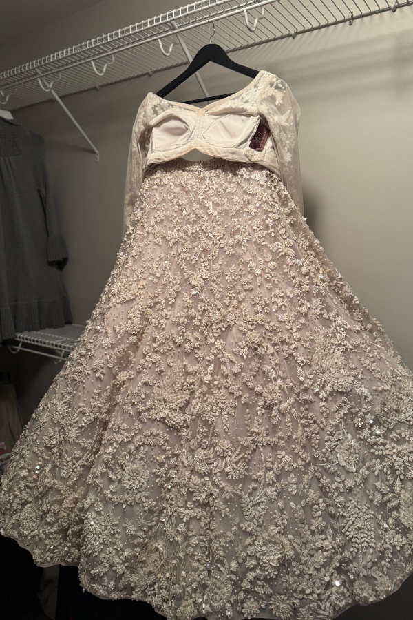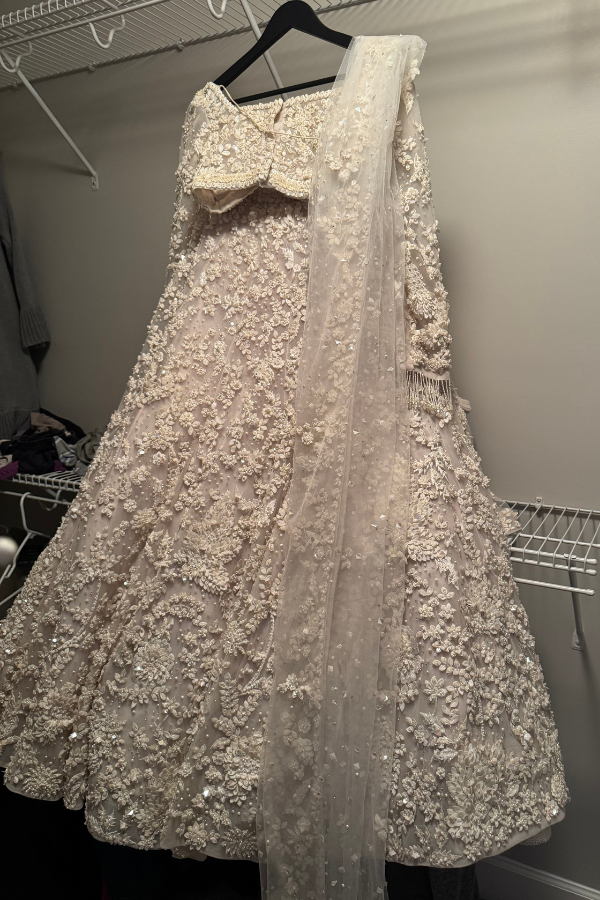 Description: Seema Gujral features a cream lehenga in net base with three dimensional, sequins, and pearl embroidery. It is paired with a matching blouse having pearl tassels and a plunging neckline, including an embroidered dupatta. Accentuate it with diamond jewellery and heels for a bridal look.