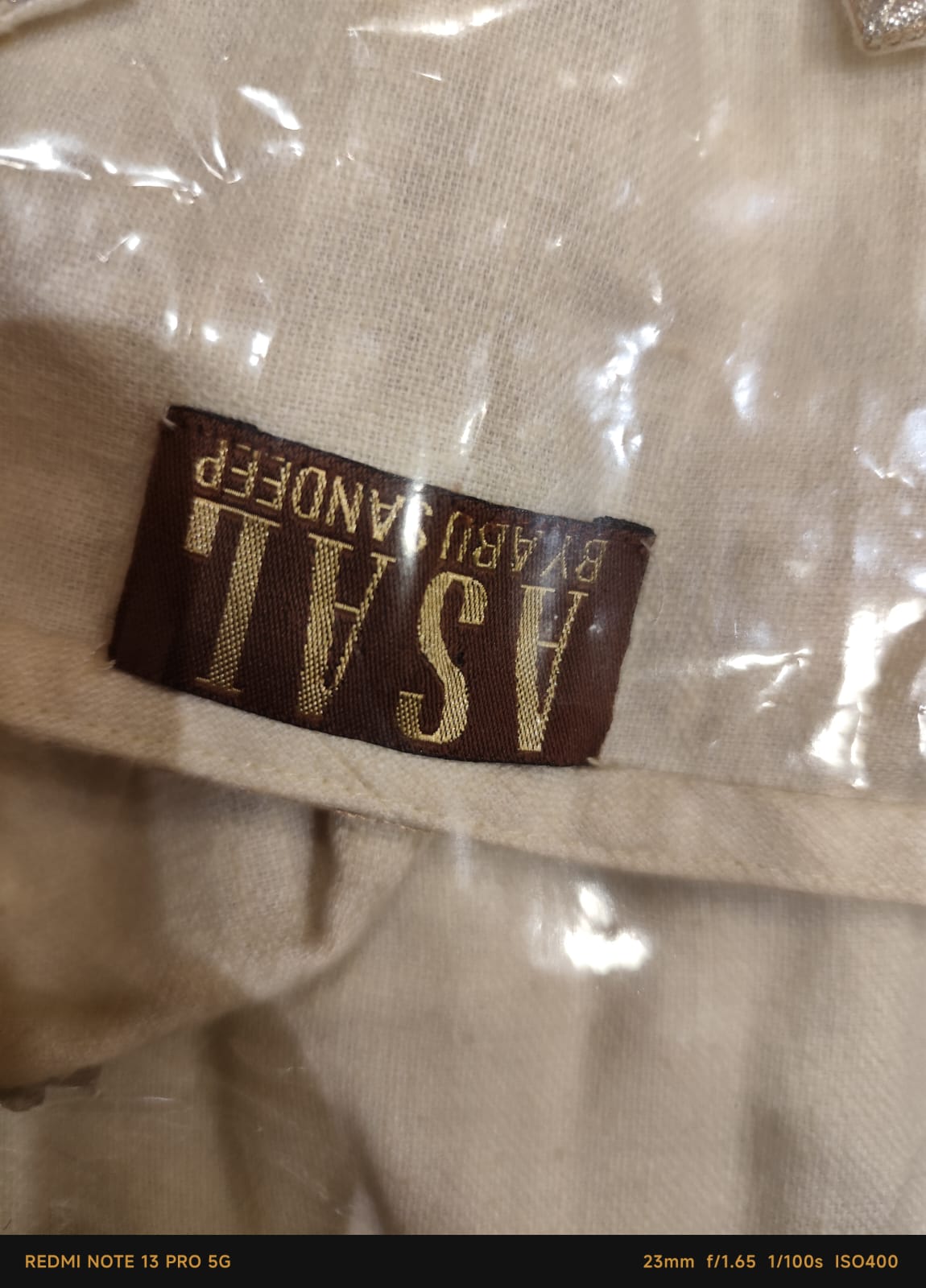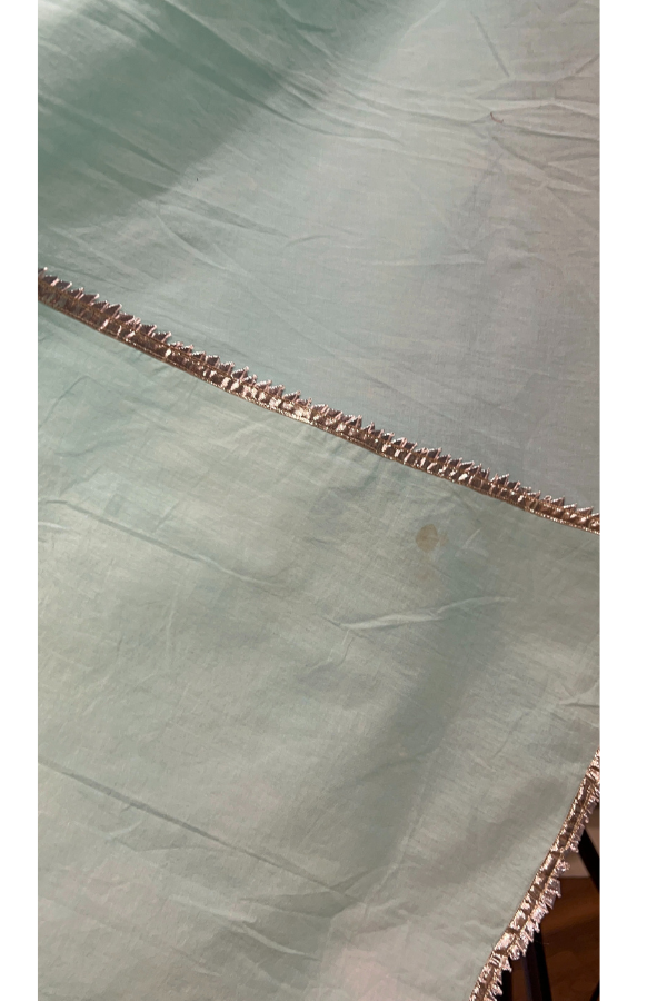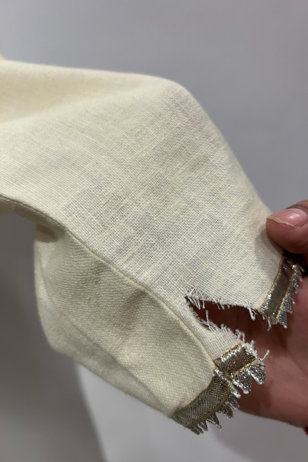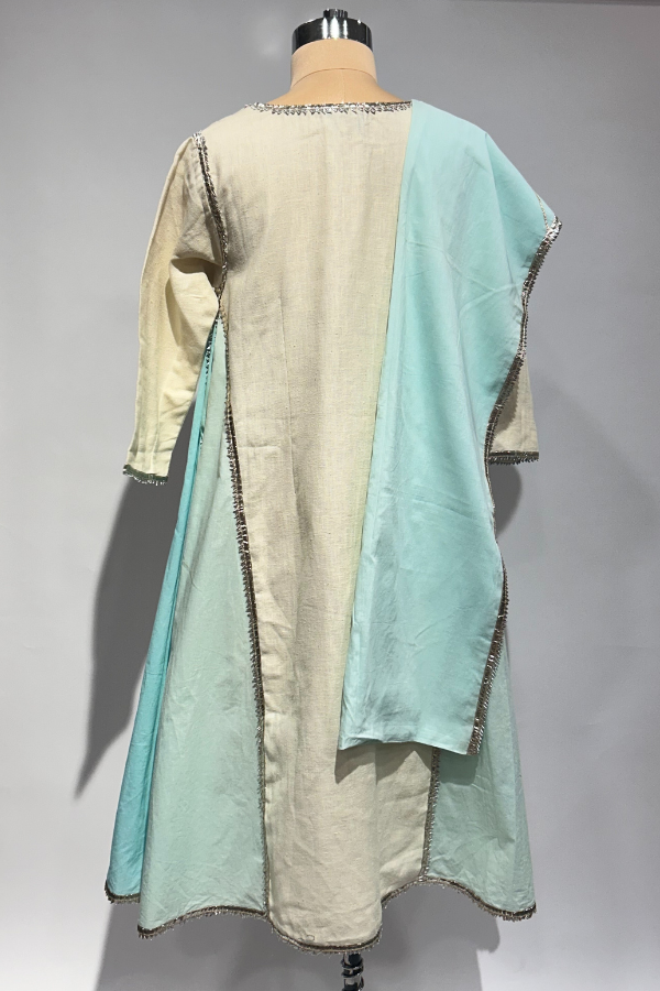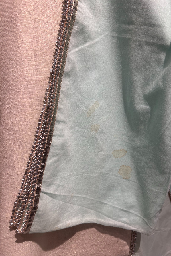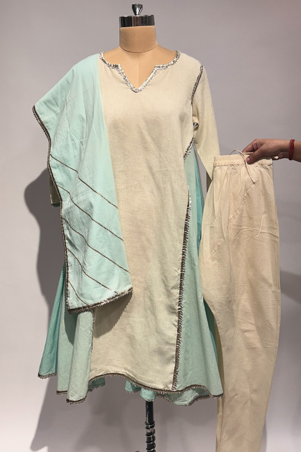 Description: A minimal yet elegant kurta set by Abu Jani Sandeep Khosla, featuring a soft ivory and mint green color palette. The set includes a V-neck kurta with subtle gota detailing along the edges, a coordinated dupatta with metallic stripes, and cream trousers for a refined, understated look.
