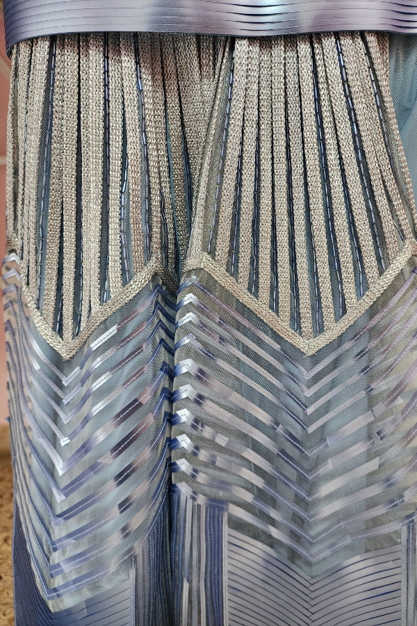 Description: A contemporary Amit Aggarwal gown in icy blue, featuring a structured bodice with metallic linear detailing and a satin waistband that accentuates the waist. The gown flows into a voluminous skirt with geometric sheer panels, blending elegance with a modern, architectural flair., this gown is ideal for tall frames (169 cm and above) and pairs beautifully with high heels. The structured flow and metallic sheen add dimension, making it perfect for evening galas, weddings, red carpets, or high-fashion events. Size: Suitable for a Medium frame; 32 B chest (worn by someone 169 cm tall).