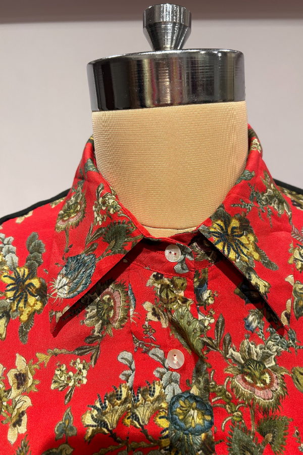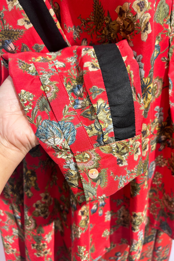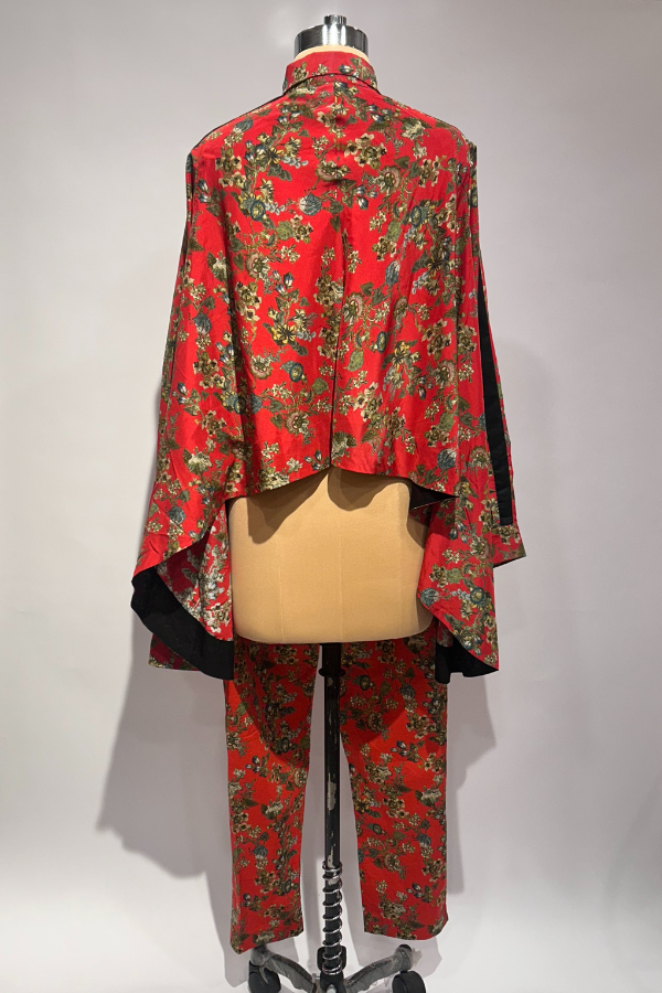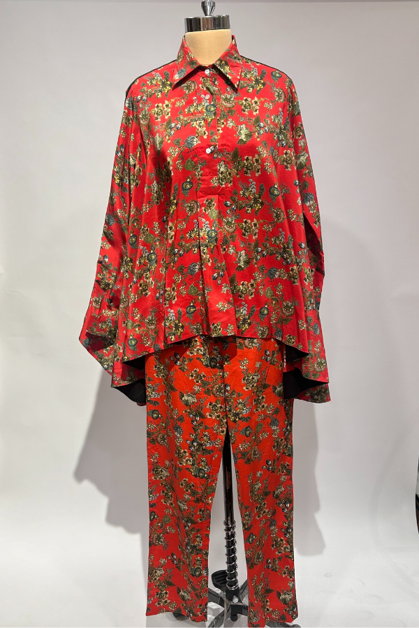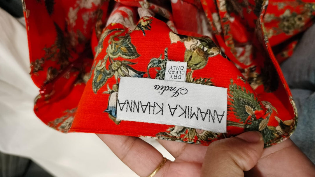 Description: A vibrant Anamika Khanna co-ord set featuring a bold red floral print on a flowy high-low shirt paired with straight-fit trousers. The set exudes contemporary elegance with a playful yet sophisticated silhouette, ideal for festive or statement daywear.