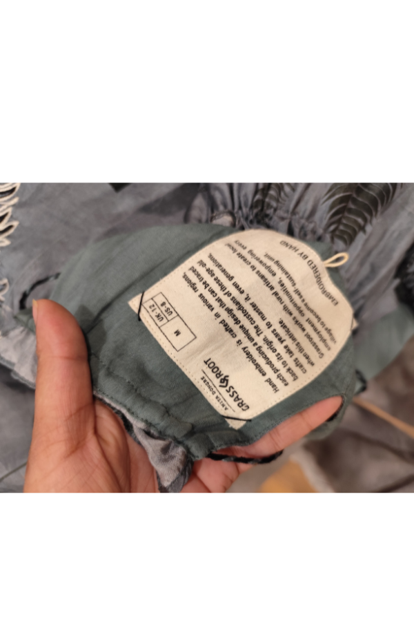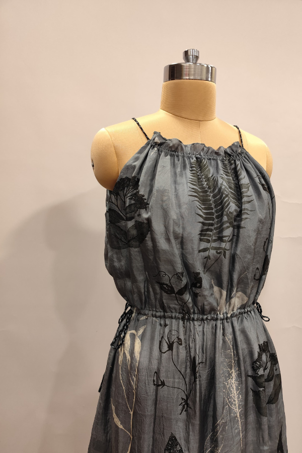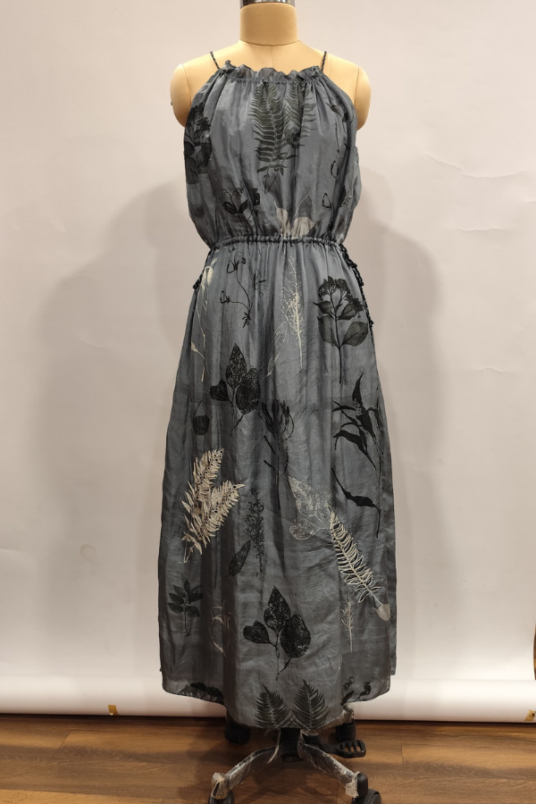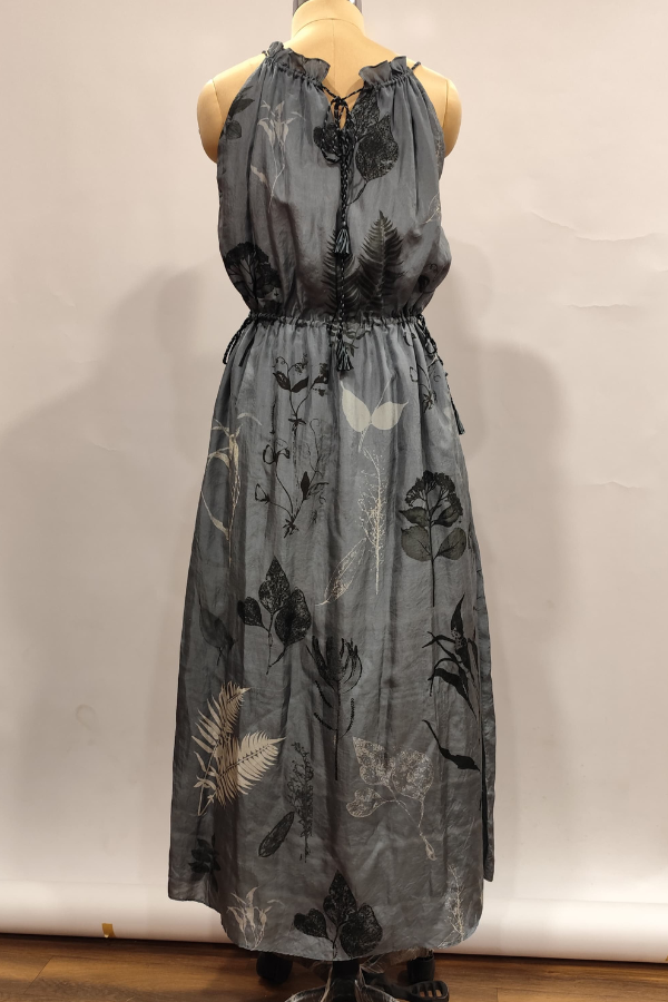 Description: A graceful grey maxi dress by Anita Dongre, featuring a halter neckline, cinched waist, and delicate black botanical prints that evoke an earthy elegance and understated charm.