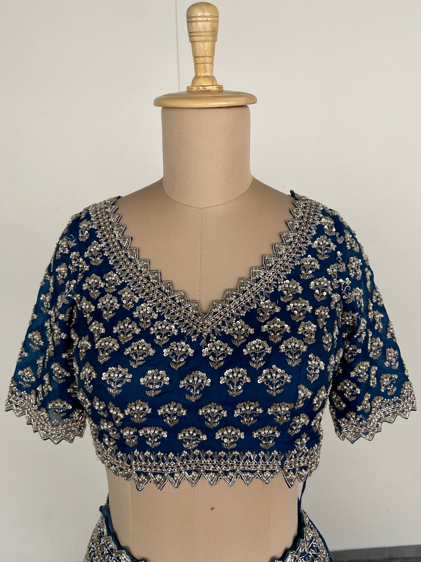 Description: An elegant blue lehenga set adorned with intricate embroidery, paired with a statement purple dupatta featuring delicate embellishments. A timeless festive ensemble that beautifully blends classic craftsmanship with a vibrant colour contrast—perfect for weddings and special celebrations.