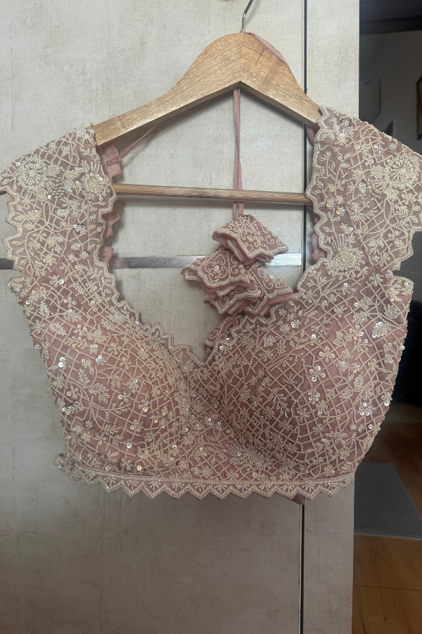 Description: A romantic Anushree Reddy lehenga in a soft blush pink hue, adorned with intricate all-over floral embroidery. Paired with a delicately detailed blouse and a sheer dupatta, this elegant ensemble is perfect for bridal functions, receptions, or pastel-themed wedding celebrations.