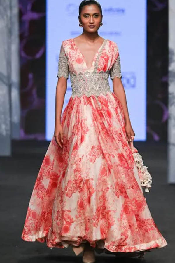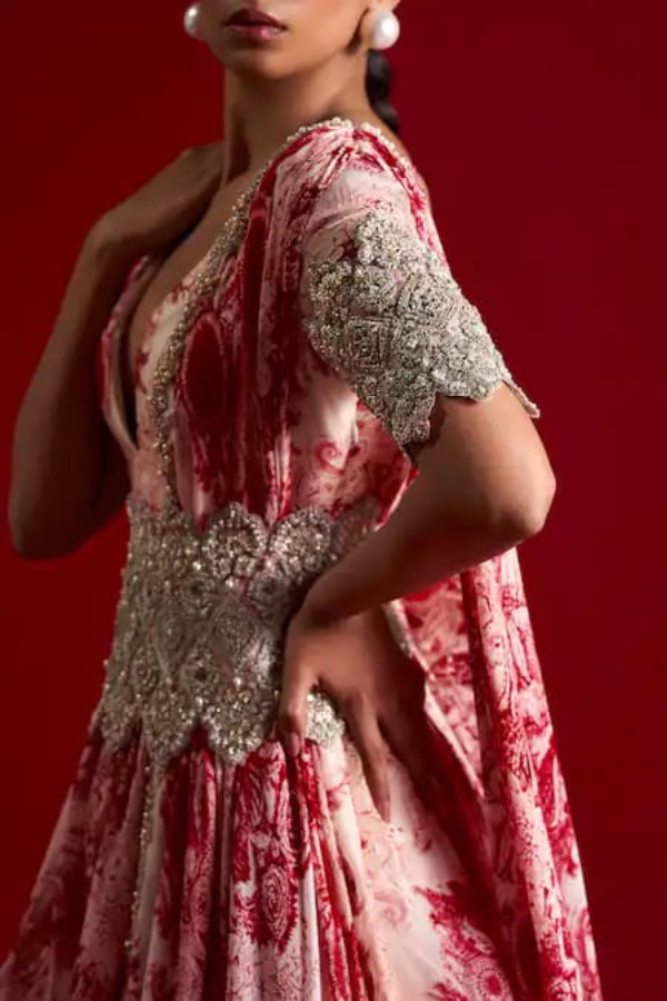 Description: Red Organza Print And Embroidery Blossom Print Zardozi Plunge Anarkali With Belt.