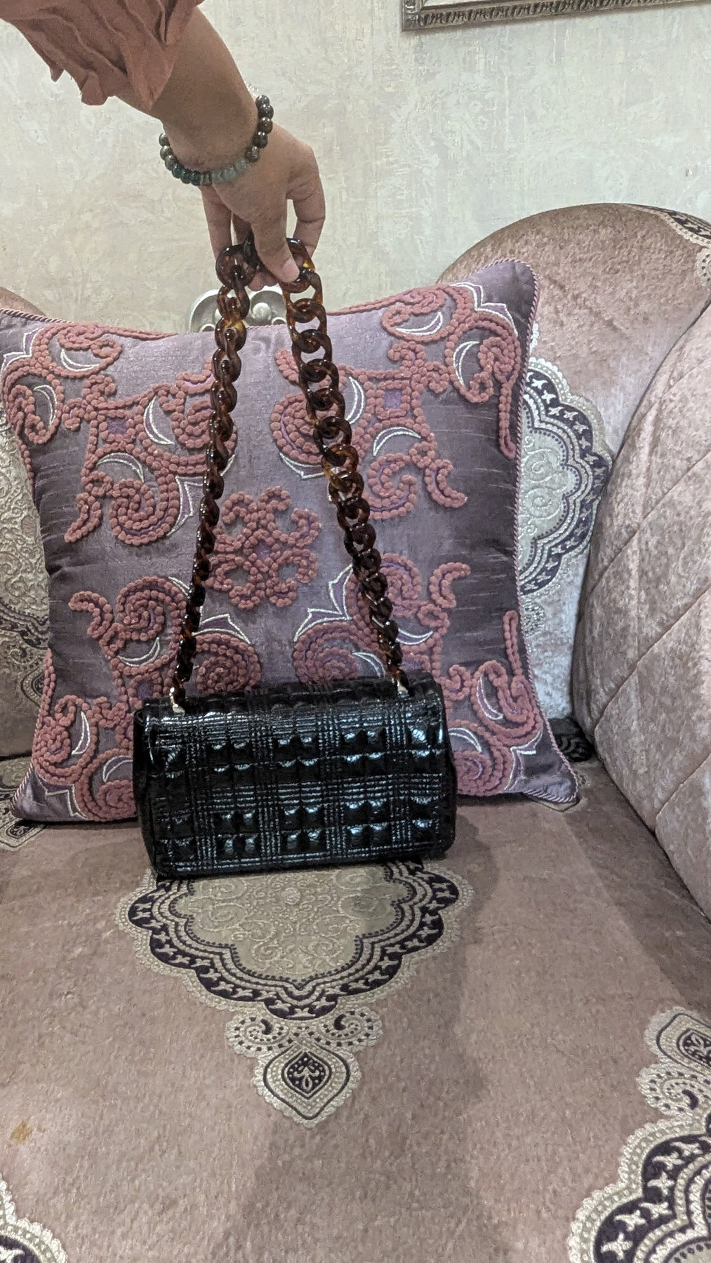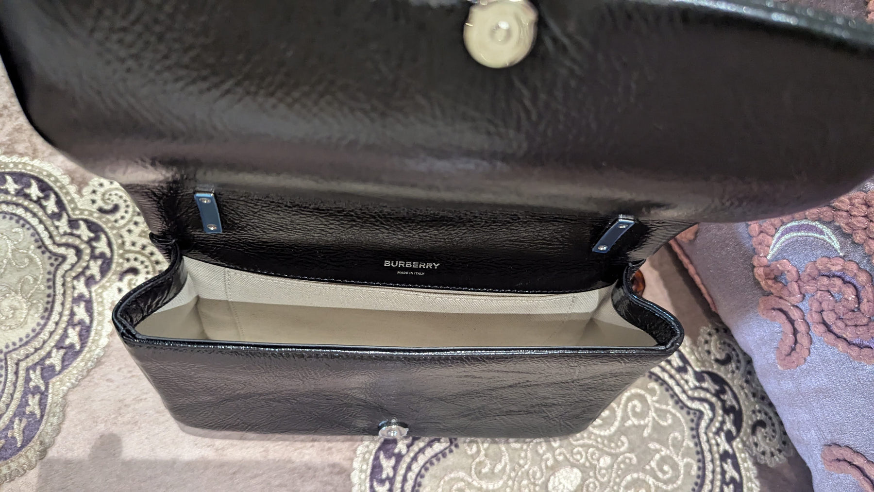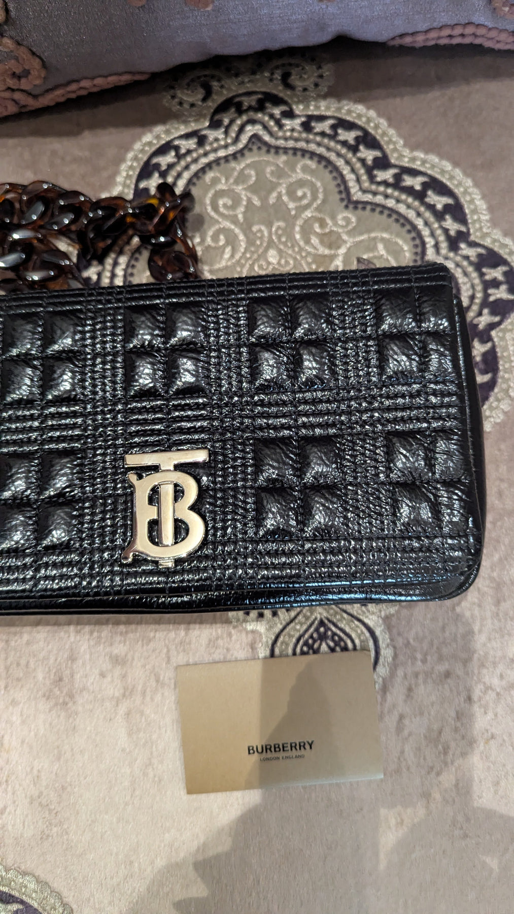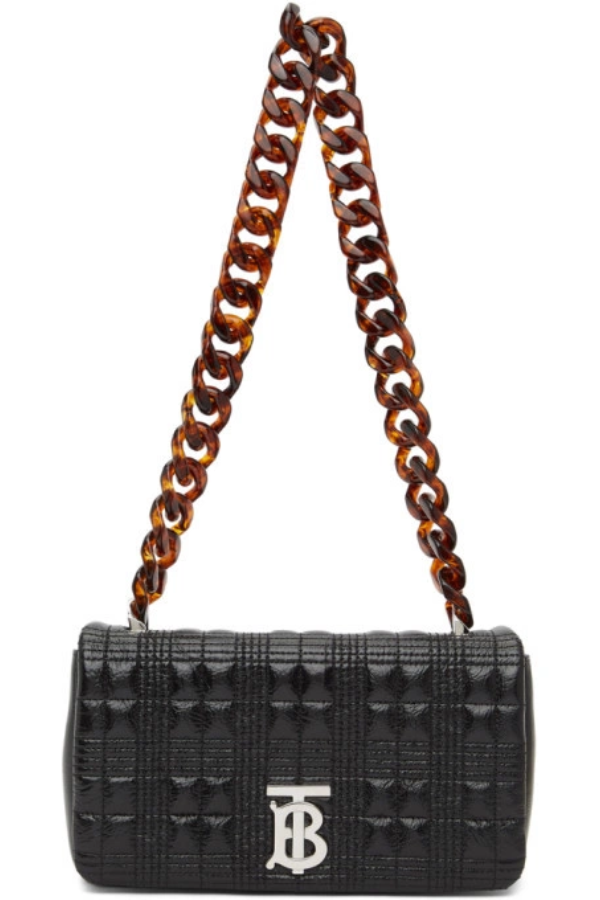 Description: Burberry quilted leather shoulder bag featuring the iconic TB monogram clasp and a statement tortoiseshell-effect chain strap, blending classic British elegance with a modern edge.