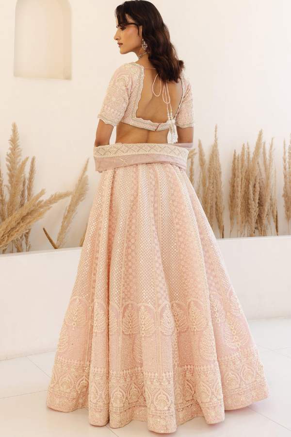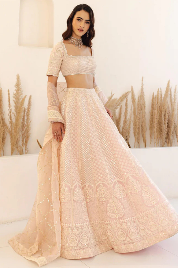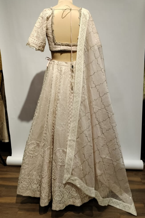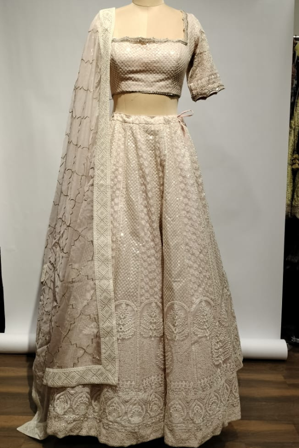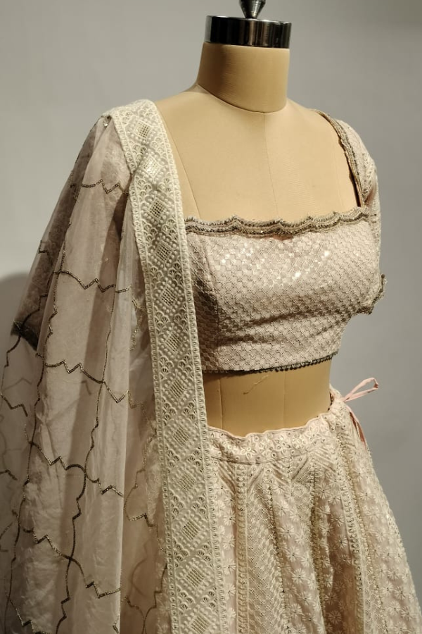 Measurements: Blouse length - 14.5 inch, Lehenga length - 43.5 inch, Front neck depth - 8 inch, Sleeve length - 11
