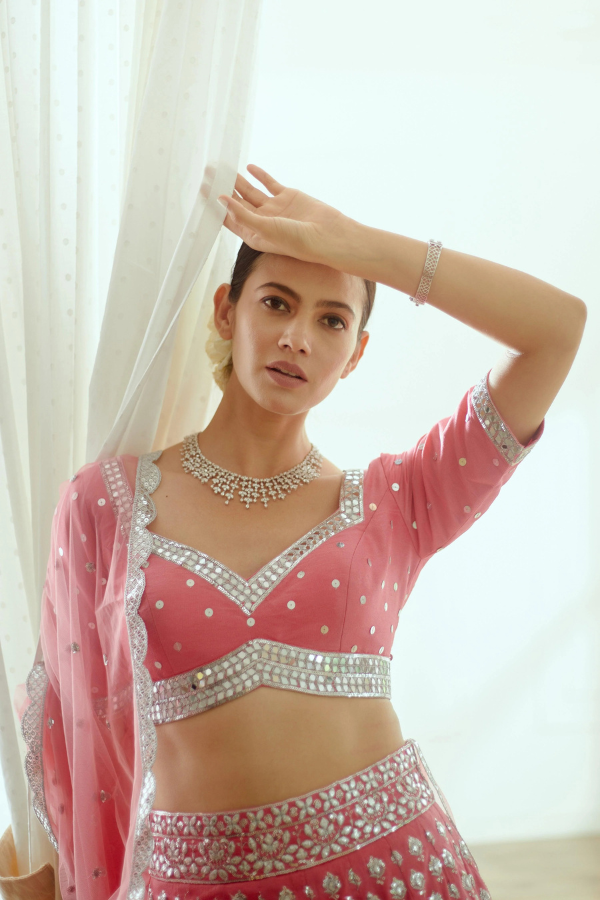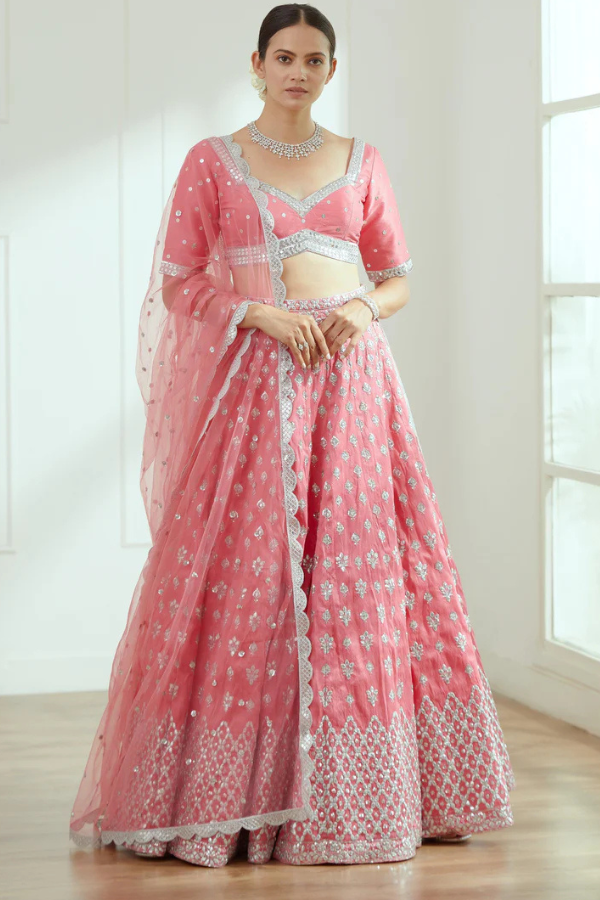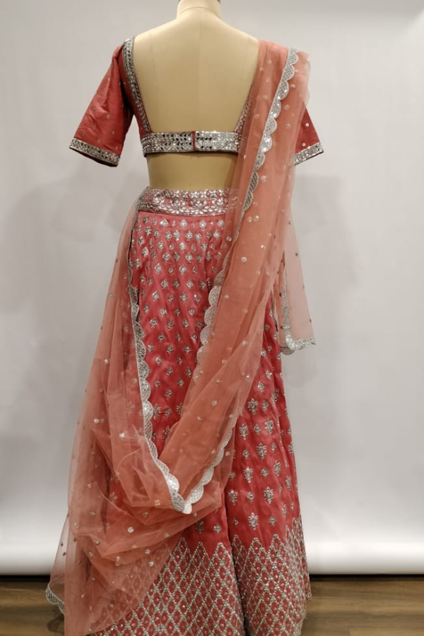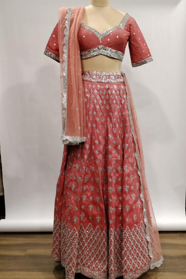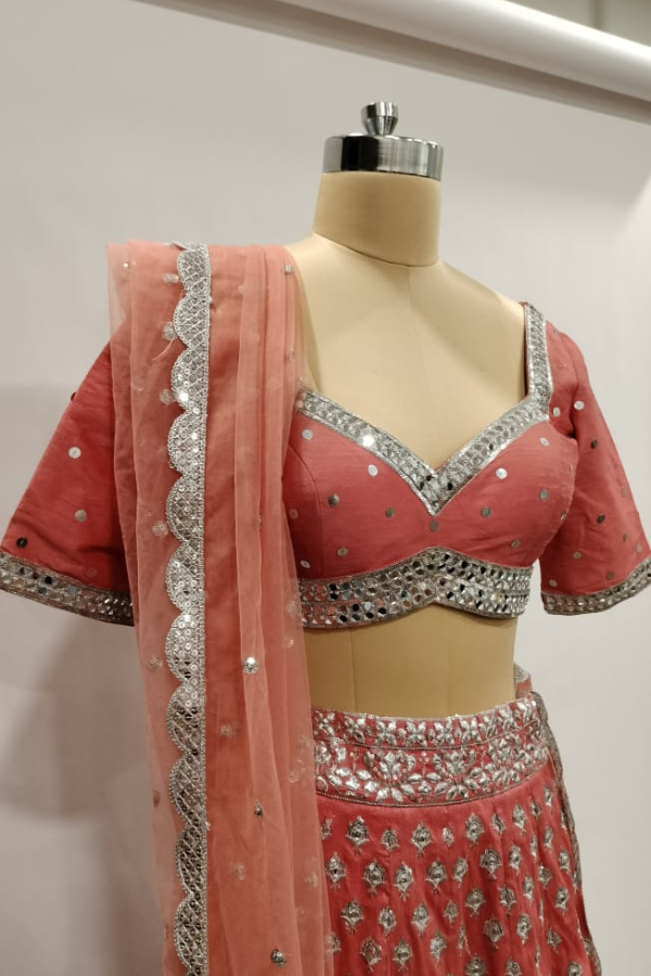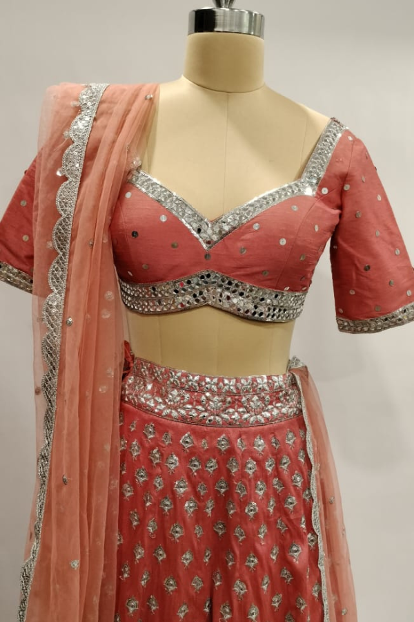 Measurements: Blouse length - 13.5 inch, Lehenga length - 44.5 inch, Front neck depth - 10 inch, Sleeve length - 11