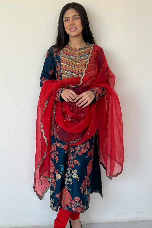 Description: A rich navy kurta set adorned with intricate multicolour thread and zari embroidery, paired with a vibrant red dupatta featuring delicate embellishments. The bottoms are not available. Elegant, festive, and timeless—perfect for traditional functions, family celebrations, or intimate festivities.