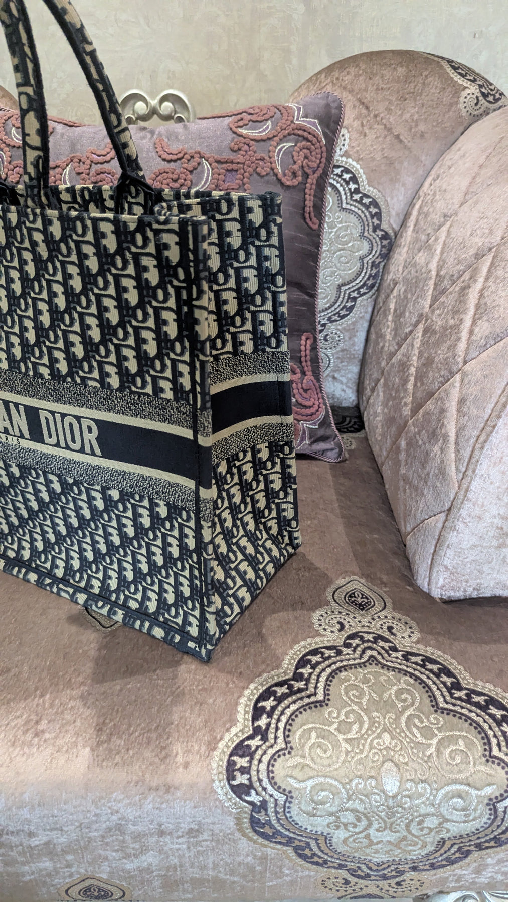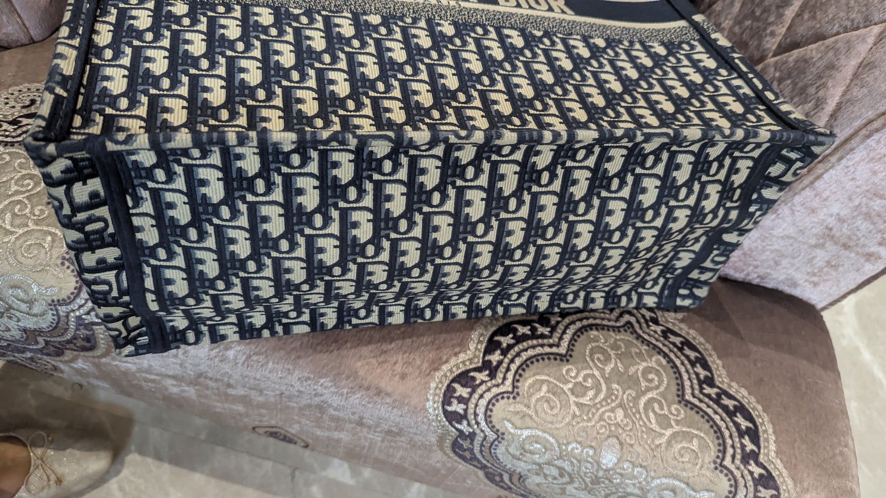 Description: The Dior Book Tote in navy blue Oblique embroidery brings a graphic rhythm to its generous, boxy shape. The dense weave gives the pattern real depth, framed by the bold Christian Dior band across the front. With its dual top handles and open interior, it’s a carryall made for days when you want everything at hand.