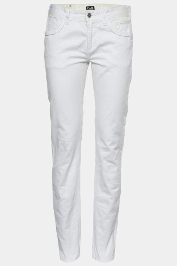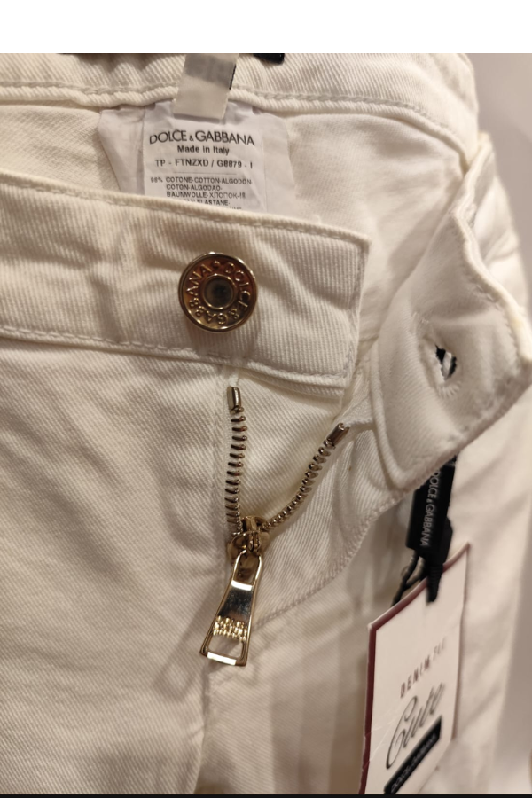 Description: Dolce & Gabbana white denim jeans with original tags attached. Features a classic fit with premium construction. Note: minor marking present, does not affect overall appearance.