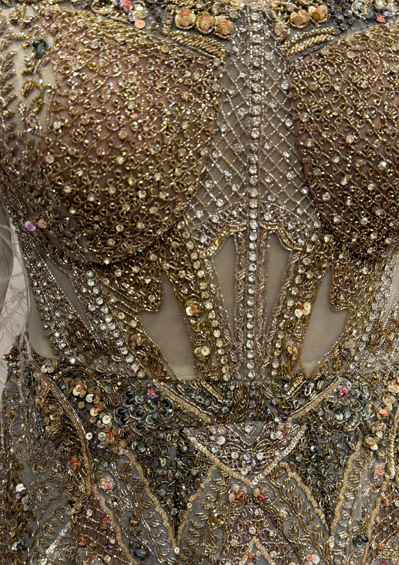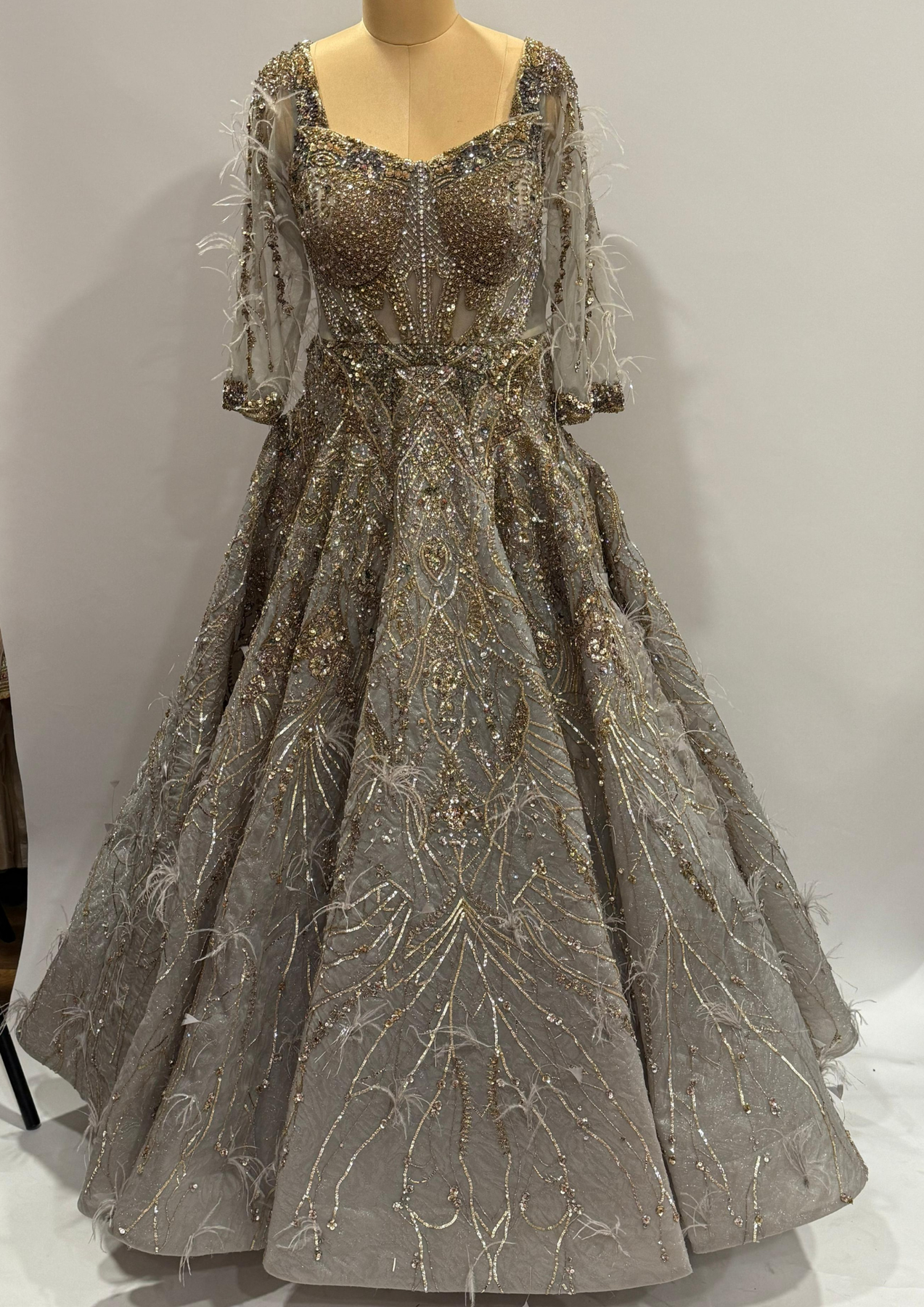 Description: An exquisite grey embellished gown featuring intricate gold and silver sequin work, delicate feather detailing, and a structured bodice with sheer paneling. The voluminous silhouette and three-quarter sleeves add a touch of regal elegance, perfect for a statement evening look.