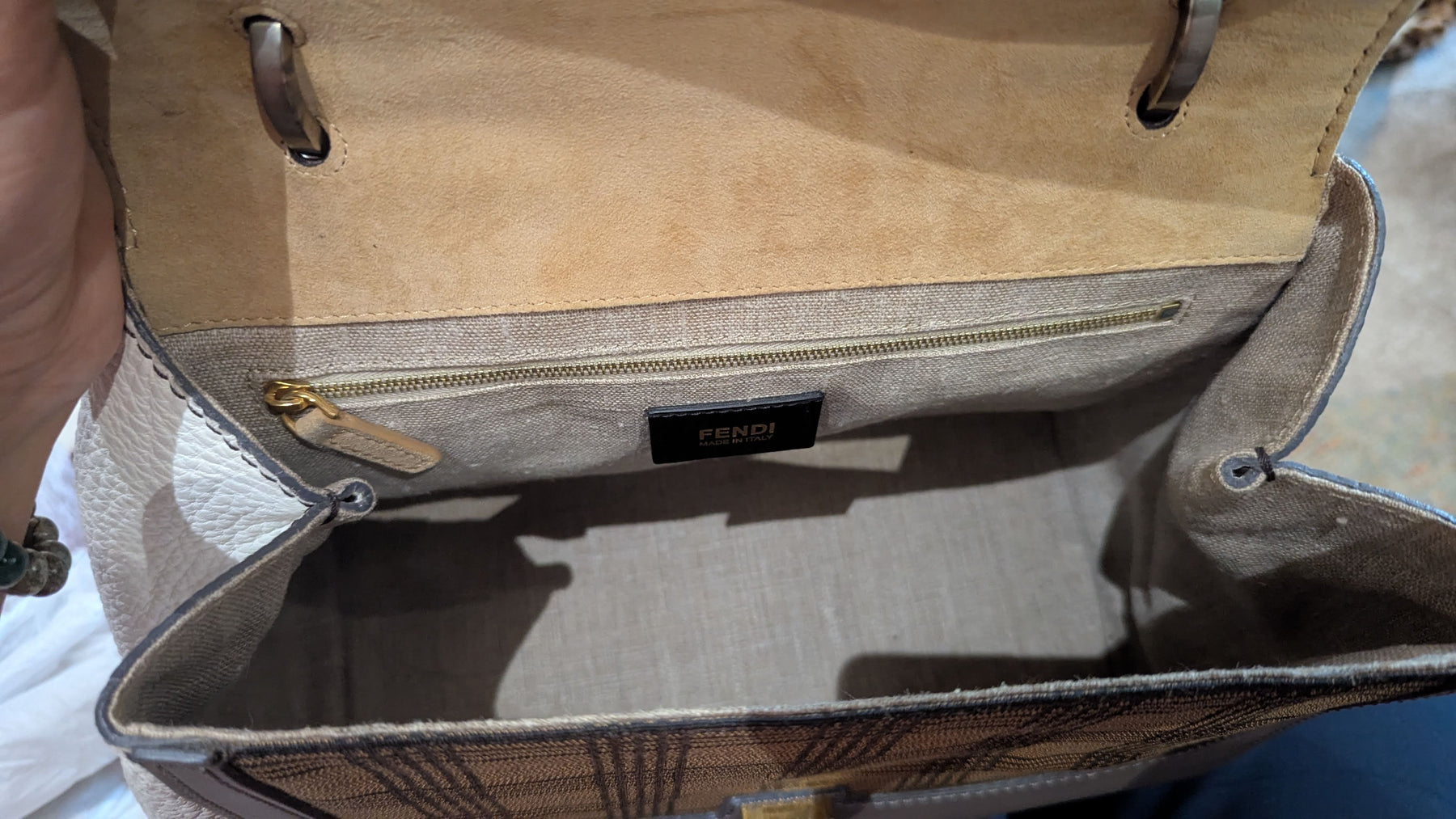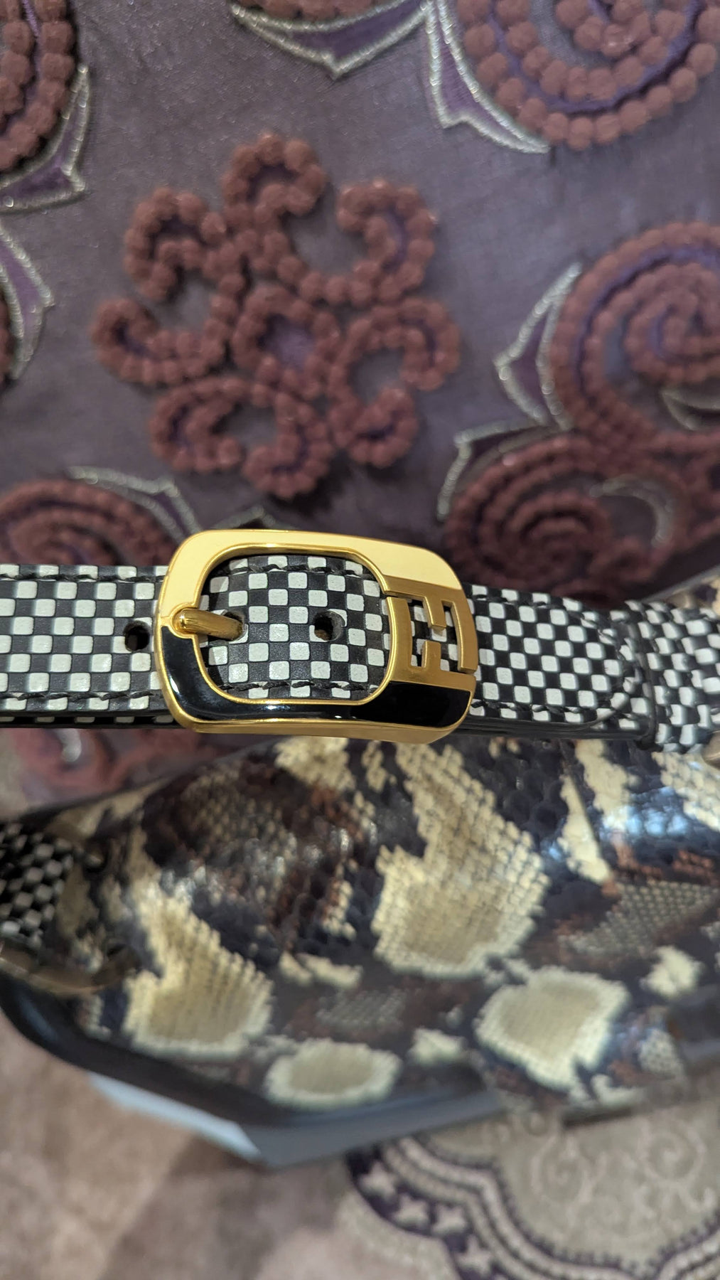 Description: This Silvana bag by Fendi has a sophisticated look. Crafted from python leather and leather, this multicolor bag is equipped with a front flap that opens to a spacious interior. It features a single top handle and protective metal feet. Team this fabulous creation with your everyday looks.