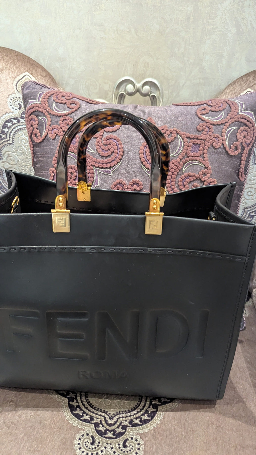 Description: A sleek and structured shopper crafted in black leather, featuring the iconic hot-stamped FENDI ROMA logo and signature tortoiseshell plexiglass handles. Designed with a spacious lined interior, gold-finish hardware, and a detachable shoulder strap for versatile hand or shoulder carry.