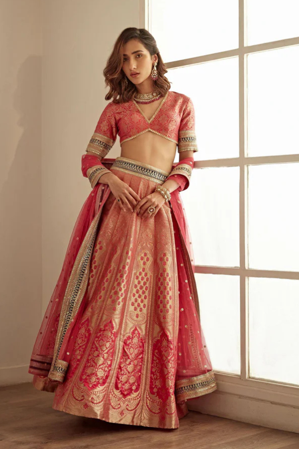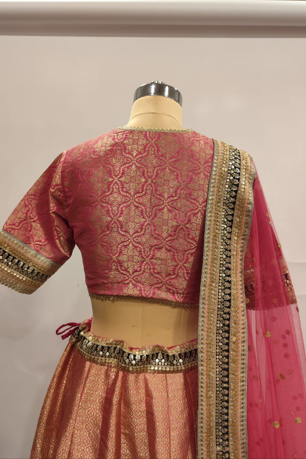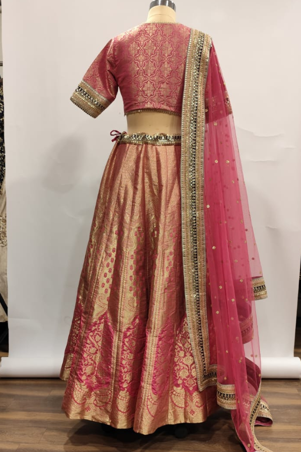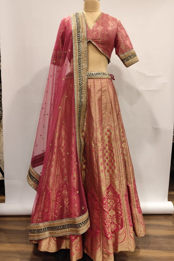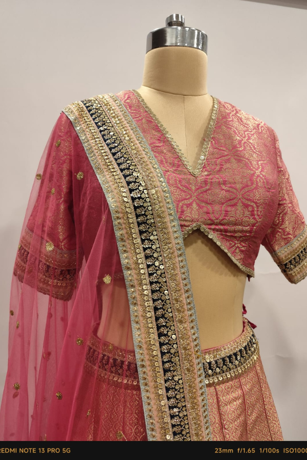Measurements: Blouse length - 14 inch, Lehenga length - 43 inch, Front neck depth - 10 inch, Sleeve length - 11