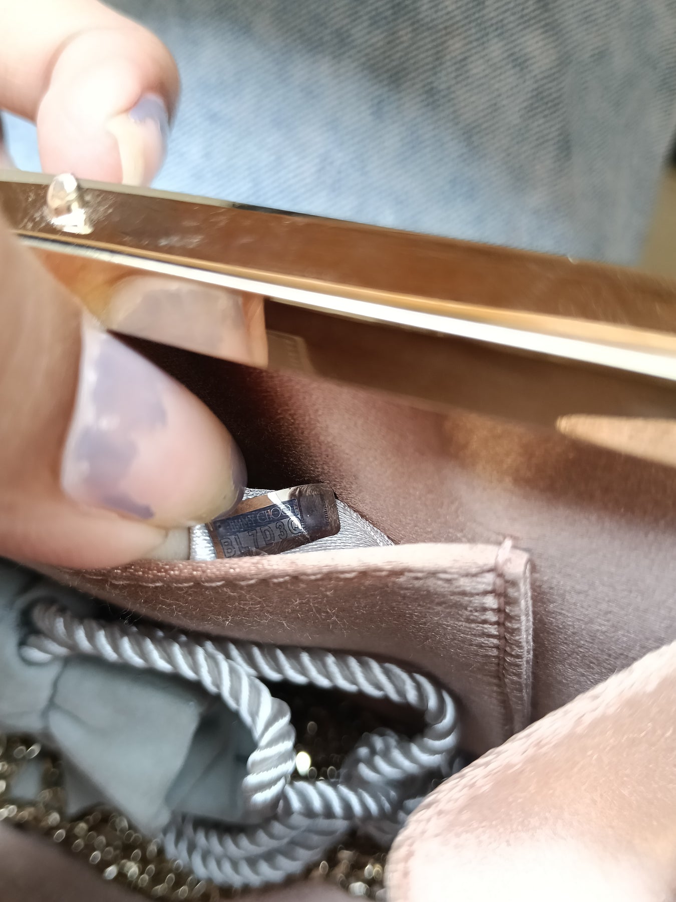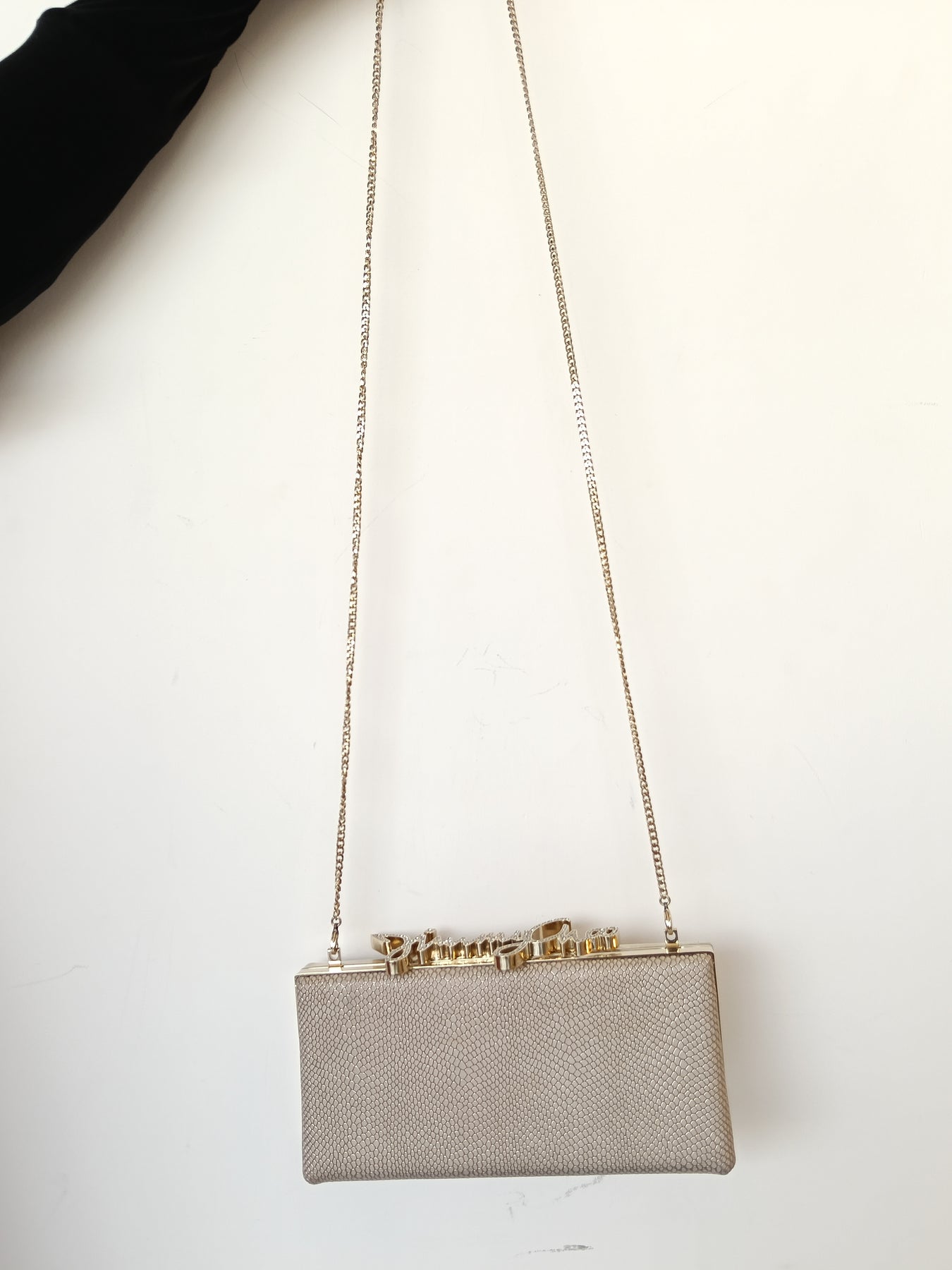 Description: A shiny clutch detailed with crystal logo lettering metal clasp and a detachable shoulder chain strap, lined with a leather plaque.