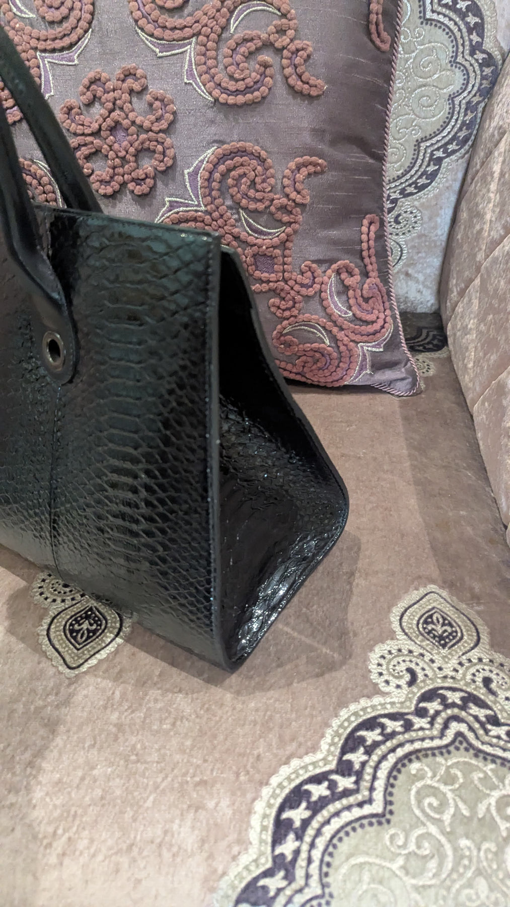 Description: A sophisticated structured tote crafted in glossy black leather, featuring a sleek silhouette with dual top handles and a polished metal turn-lock closure. Designed with a spacious interior, this timeless Jimmy Choo piece is perfect for both work and elevated everyday wear.