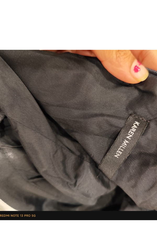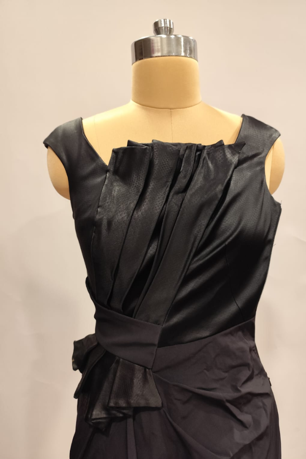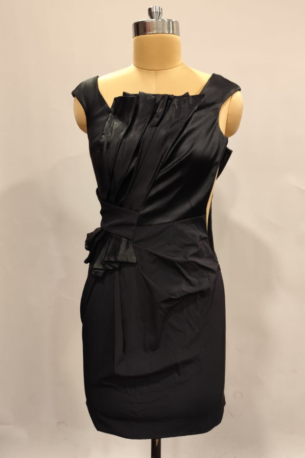Description: This Karen Millen black dress features an elegant sleeveless design with sculptural pleats across the bodice and waist, creating a dramatic, figure-enhancing silhouette. The asymmetrical draping adds a modern, couture-inspired edge, perfect for sophisticated evening wear.