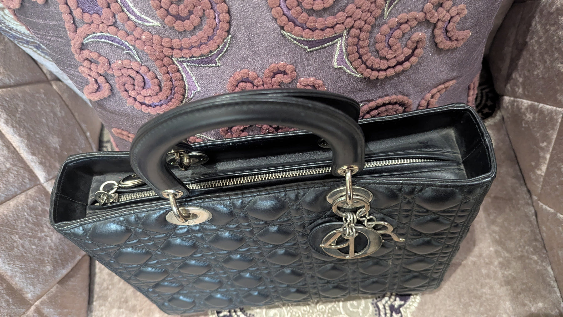 Description: Lady Dior handbag in classic black cannage-quilted leather, featuring structured top handles, silver-tone hardware, and the iconic Dior letter charms—an enduring symbol of timeless elegance.