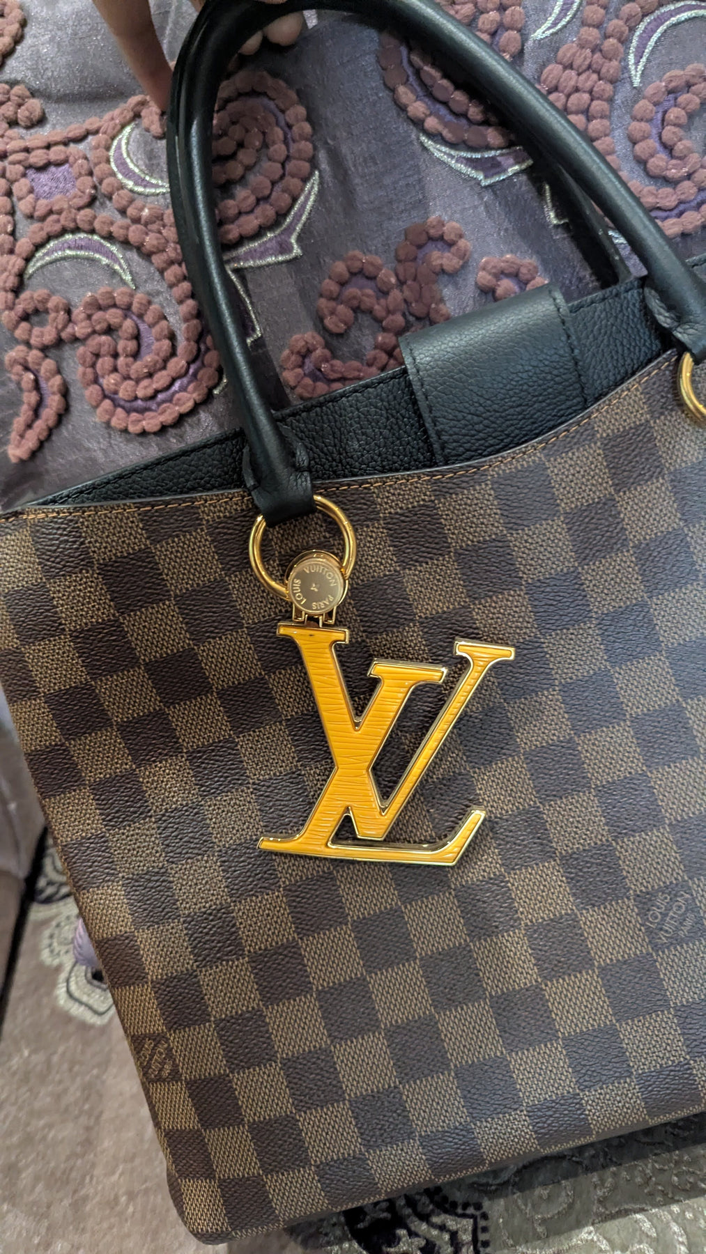 Description: The Riverside Tote, crafted from Damier Ebene coated canvas with sleek leather accents, showcases a structured silhouette that effortlessly blends elegance with functionality. Gold-tone hardware, adorned with signature LV engravings, adds a touch of sophisticated refinement.