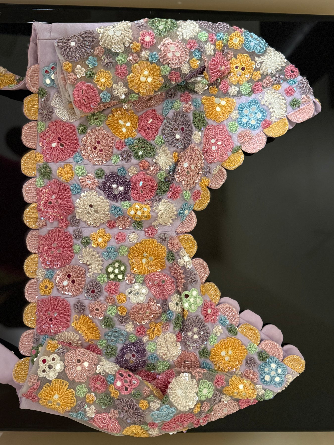 Description: A delicate Mishru lehenga set crafted in soft pastel tones, featuring intricate floral embroidery on the skirt and a beautifully detailed blouse. Paired with a sheer dupatta, this elegant ensemble is perfect for day weddings, mehendi functions, or festive celebrations.