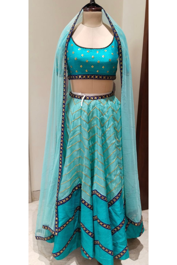 Description: A vibrant turquoise Priyal Prakash lehenga featuring intricate gold chevron embroidery, complemented by a delicately embellished blouse and a soft net dupatta with contrast border detailing. Perfect for festive and wedding celebrations!