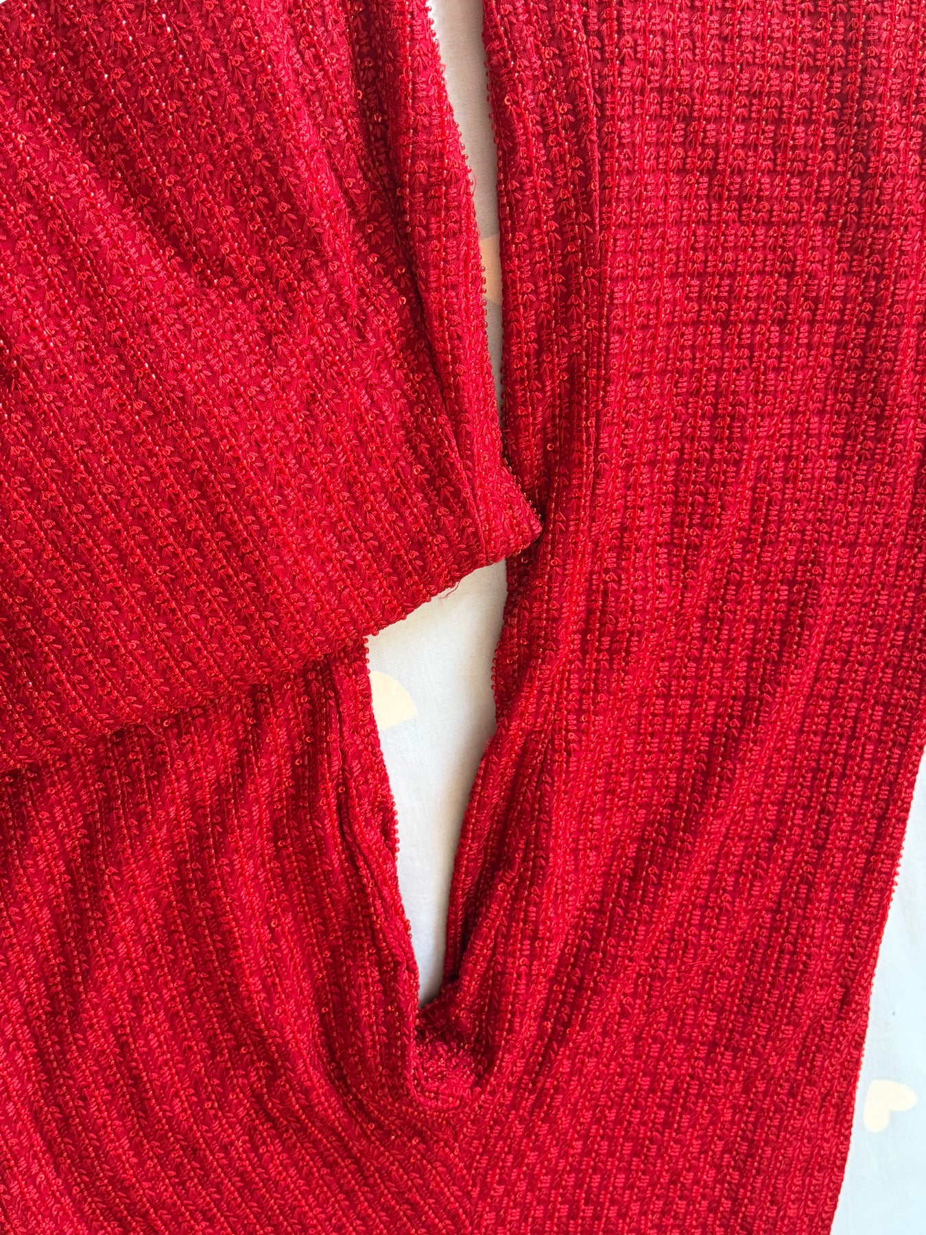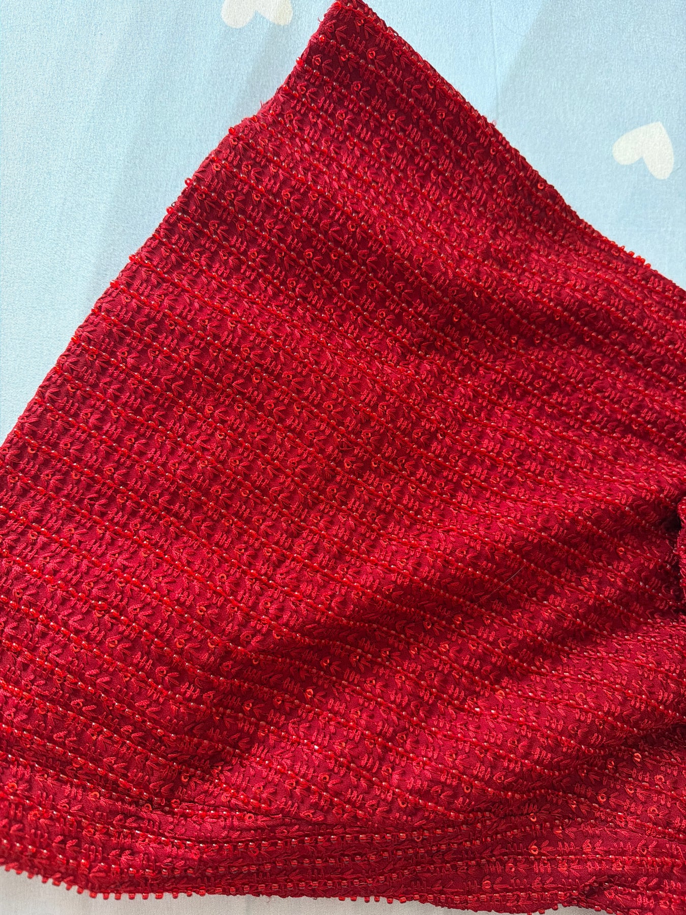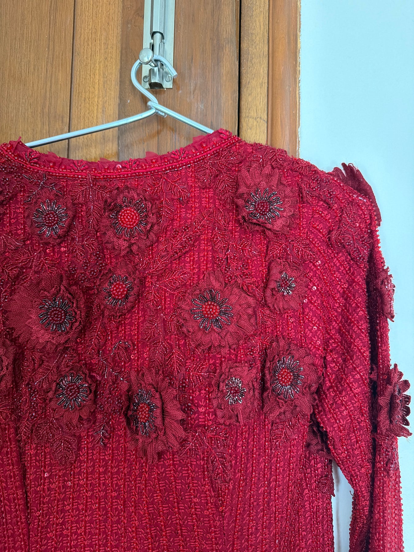 Description: A striking Ridhima Bhasin ensemble in a rich deep red hue, featuring delicate floral appliqué detailing and a flattering, flowy silhouette. Elegant yet contemporary, this outfit is perfect for festive celebrations, cocktail evenings, or intimate wedding events.