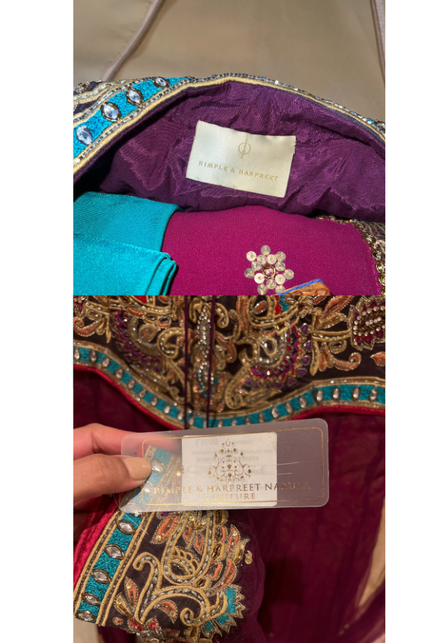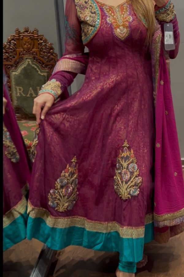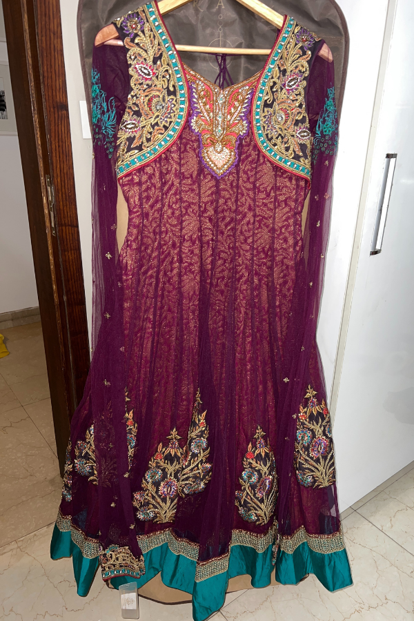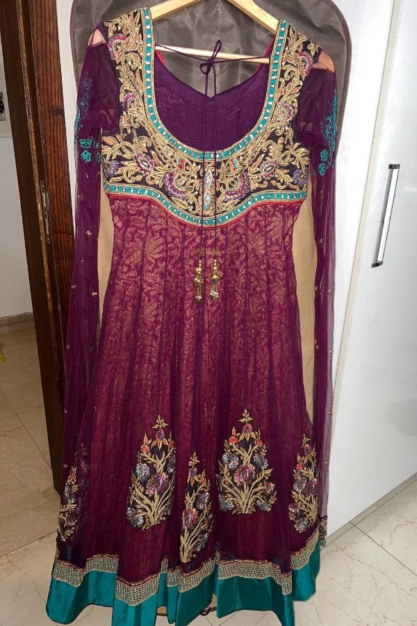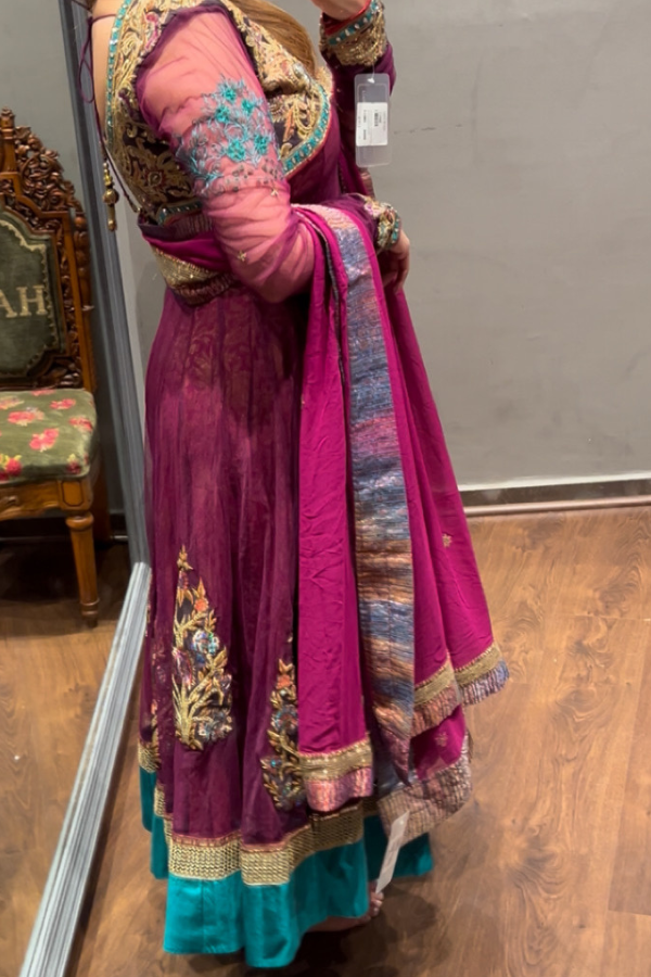 Description: A regal Rimple & Harpreet Anarkali set in deep plum net, featuring exquisite multicolored thread and zari embroidery. Accented with turquoise borders and intricate embellishments, this full-sleeve ensemble is a timeless piece perfect for festive and formal occasions.