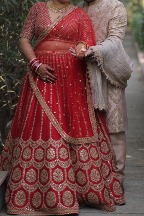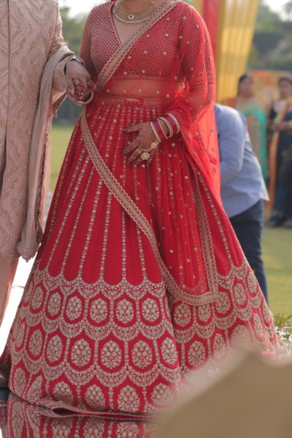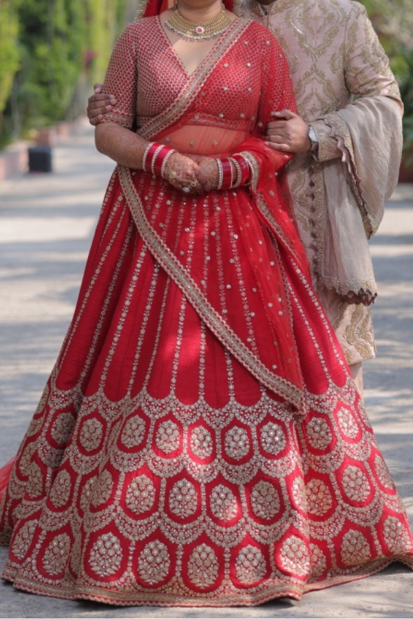 Description: A stunning red Sabyasachi bridal lehenga crafted from luxurious raw silk and net, featuring intricate gold embroidery, traditional zardozi work, and a regal silhouette—perfect for a timeless bridal look.