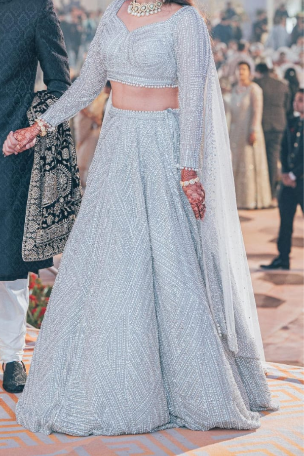This sliver pearl lehenga set features all over sequins, pearls and beads embroidery. The ensemble is paired with a full sleeves blouse and a four sided embroidered net dupatta.