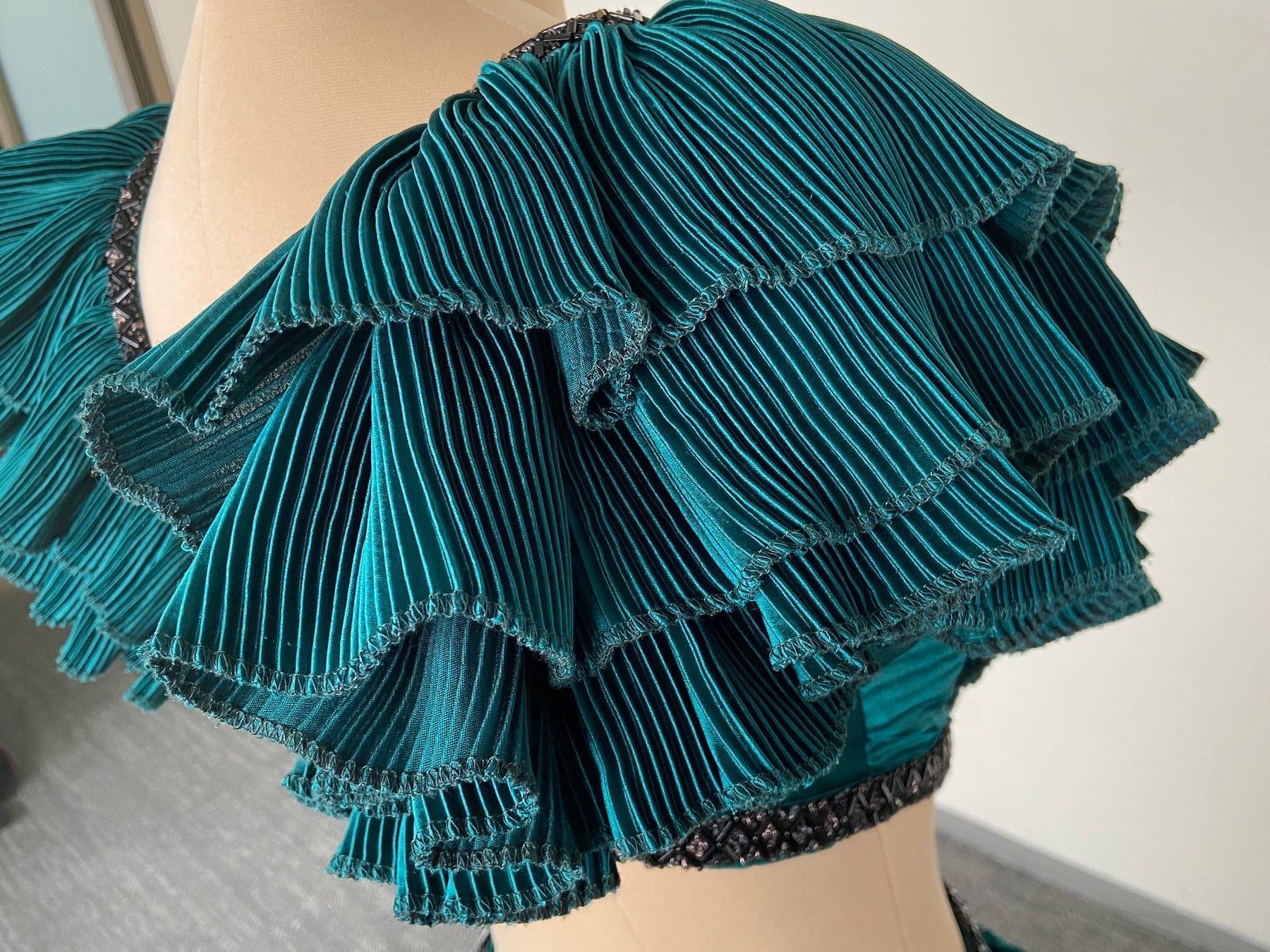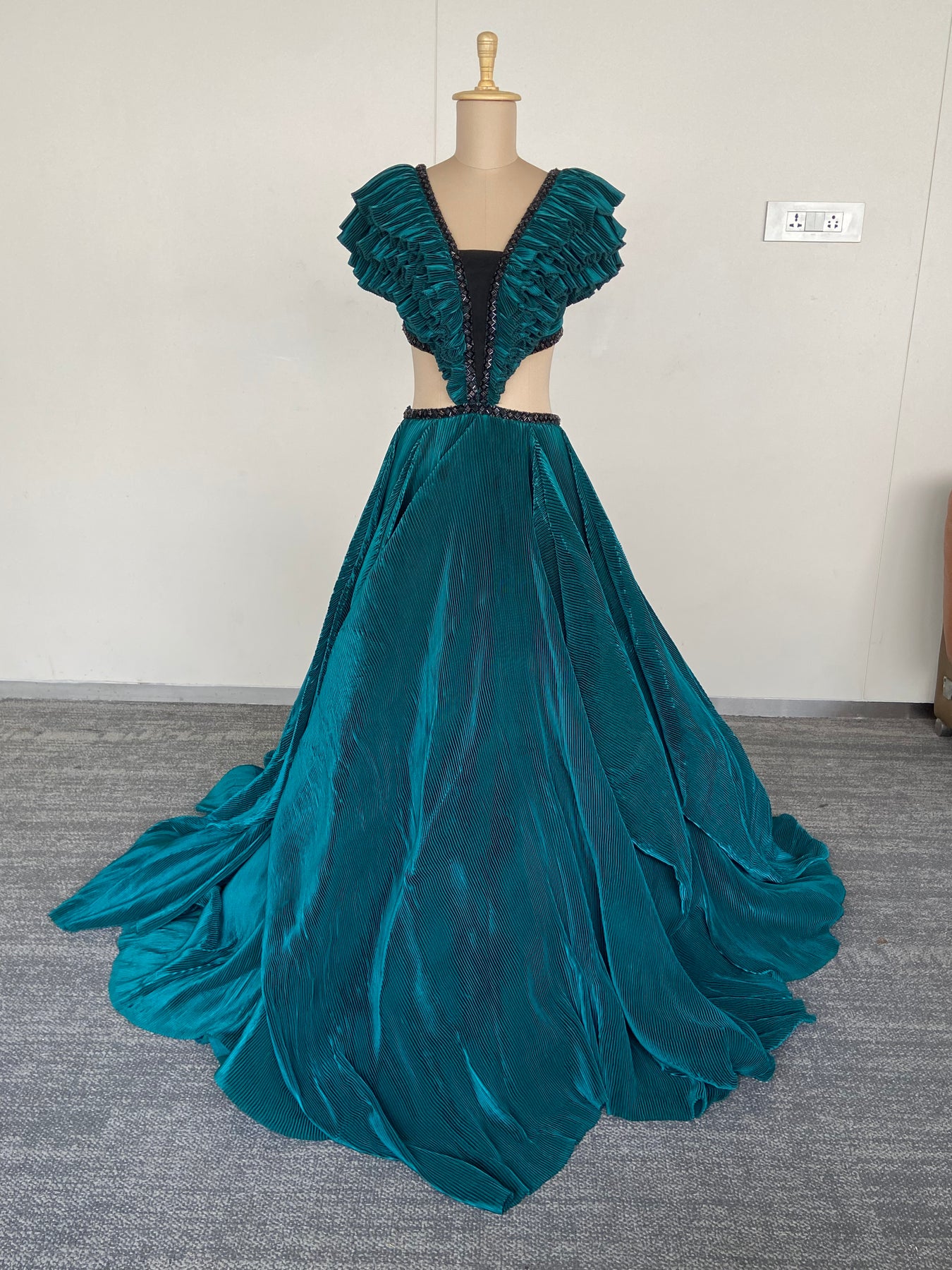 Description: A striking teal evening gown featuring dramatic ruffled sleeves, a structured bodice with cut-out detailing, and a flowing textured skirt with a soft train. A statement silhouette that blends contemporary edge with couture elegance—perfect for receptions, cocktail soirées, and grand celebrations.