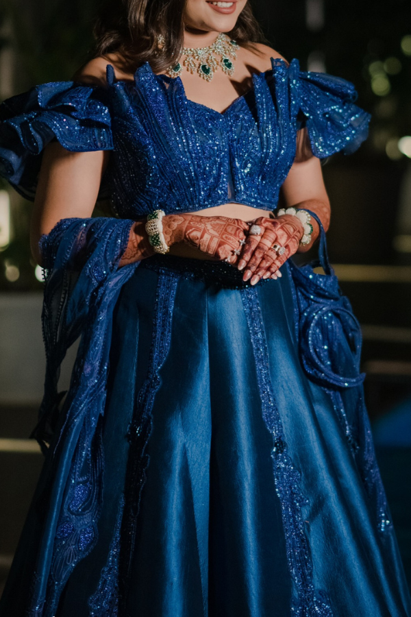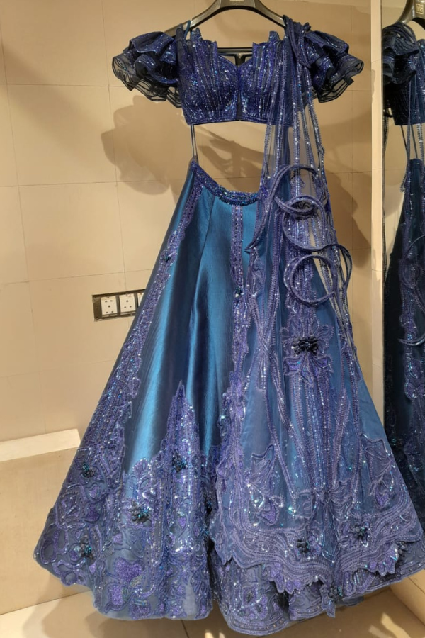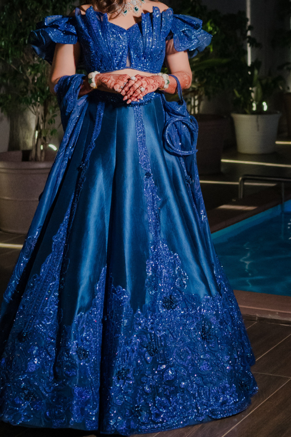 Description: An opulent Sulakshana Monga lehenga set in a rich royal blue hue, featuring intricate tonal embroidery and sequin detailing. The structured off-shoulder blouse with dramatic sleeves adds a modern edge, while the voluminous skirt exudes timeless grandeur—perfect for a glamorous evening affair.