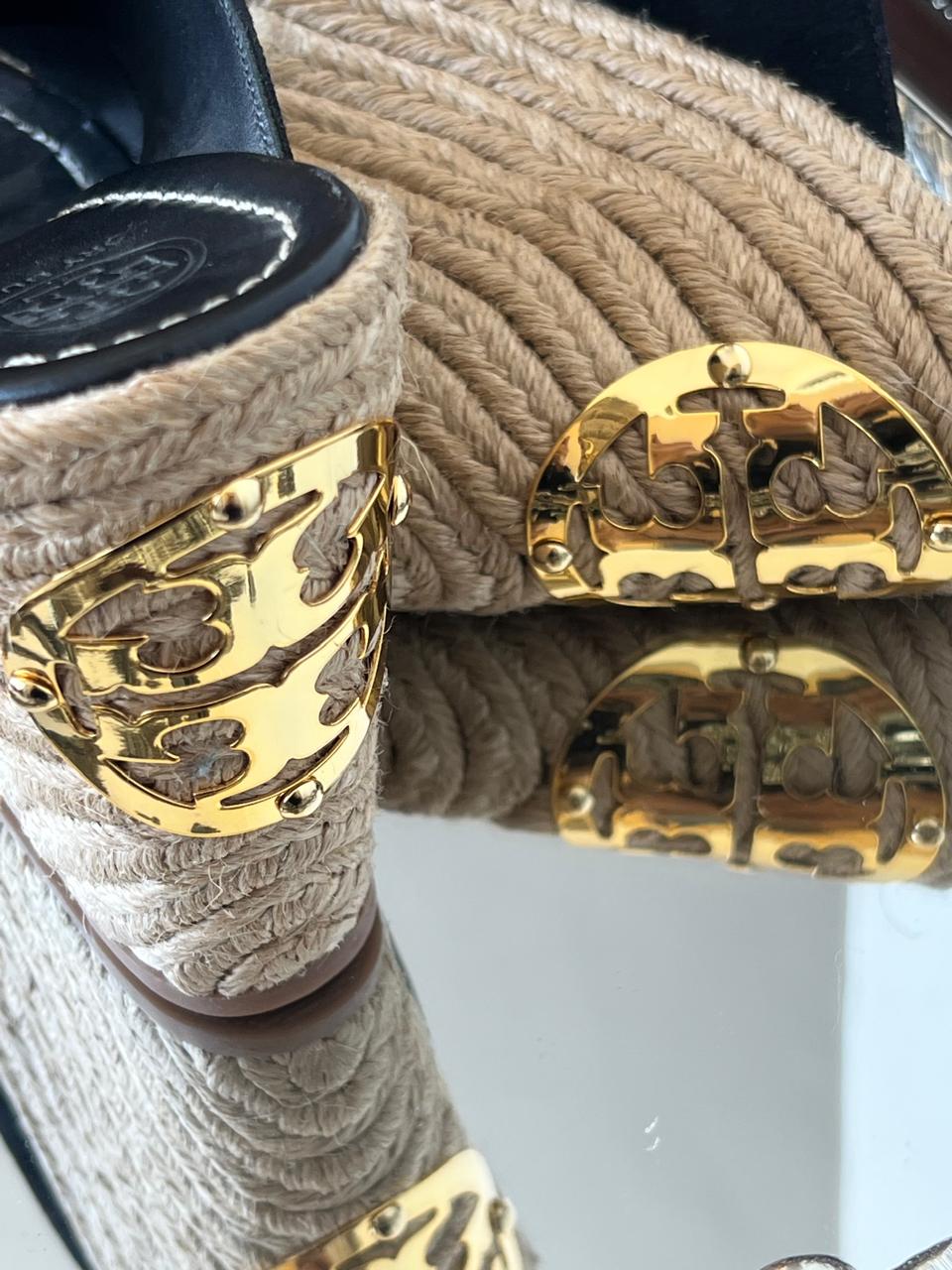 Description: Tory Burch Black Wedge Sandals crafted with soft suede straps and a natural woven espadrille wedge. Finished with the signature gold-tone logo detail at the heel, these wedges offer a chic blend of comfort and effortless elegance—perfect for day-to-evening wear.